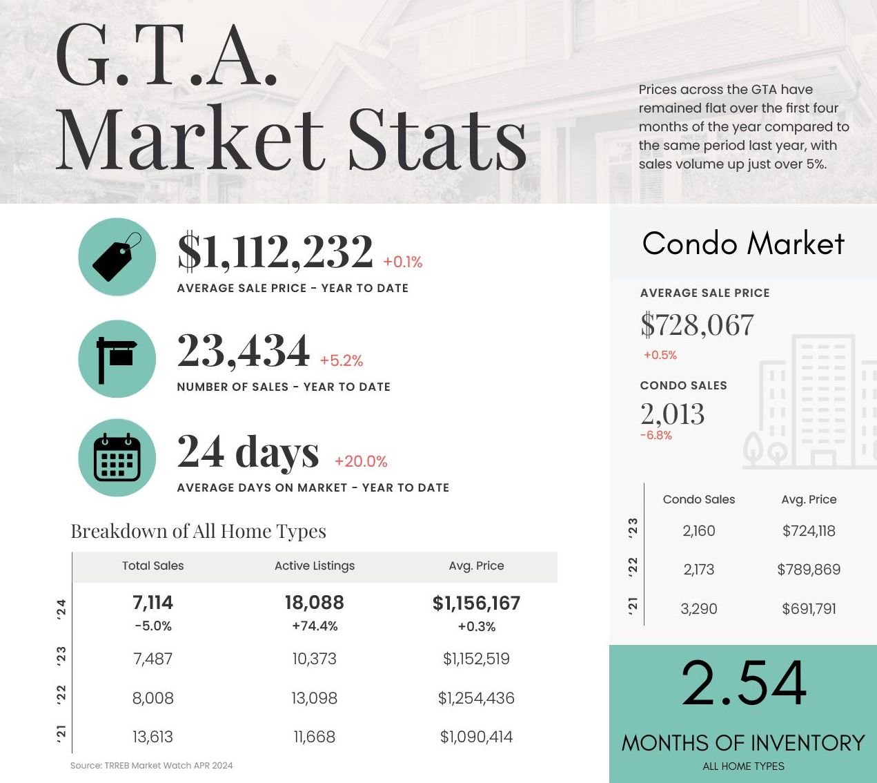 The month of April is the start of the Spring Market for Residential Real Estate, representing the beginning of the busiest time of year for real estate transactions. There were 7,114 sales through the Toronto Regional Real Estate Board – down by five per cent compared to April 2023. Inventory levels or the number of listings of available homes of all types have begun to creep up with over 18,000 available for sale at the end of April, which means there is an increased choice for home buyers. Even with greater choice, average selling prices have seen little movement showing the continued resilience in our market. Prices have remained constant, the average selling price was up by 0.3 per cent to $1,156,167 compared to March of last year.