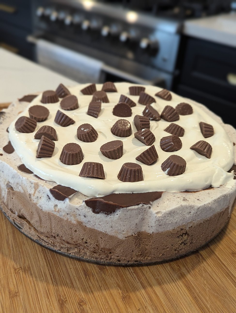 When ready to assemble, work quickly. Transfer half of the ice cream to a medium bowl and mix until spreadable, You do not want it to be melted, just workable. Spread over the prepared crust. Top first layer with chopped peanut butter cups and place the pan in freezer until set, about 30 minutes. Meanwhile, take the second half of the ice cream out and let sit at room temperature to soften. When soft, mix again until spreadable. Add second layer of ice cream on top of peanut butter cups and spread into an even layer. Add the whole bottle of smuchers - this will add a crunchy lawyer underneath the whip cream :). Firmly wrap the top with plastic wrap and let cake freeze completely for several hours to overnight.