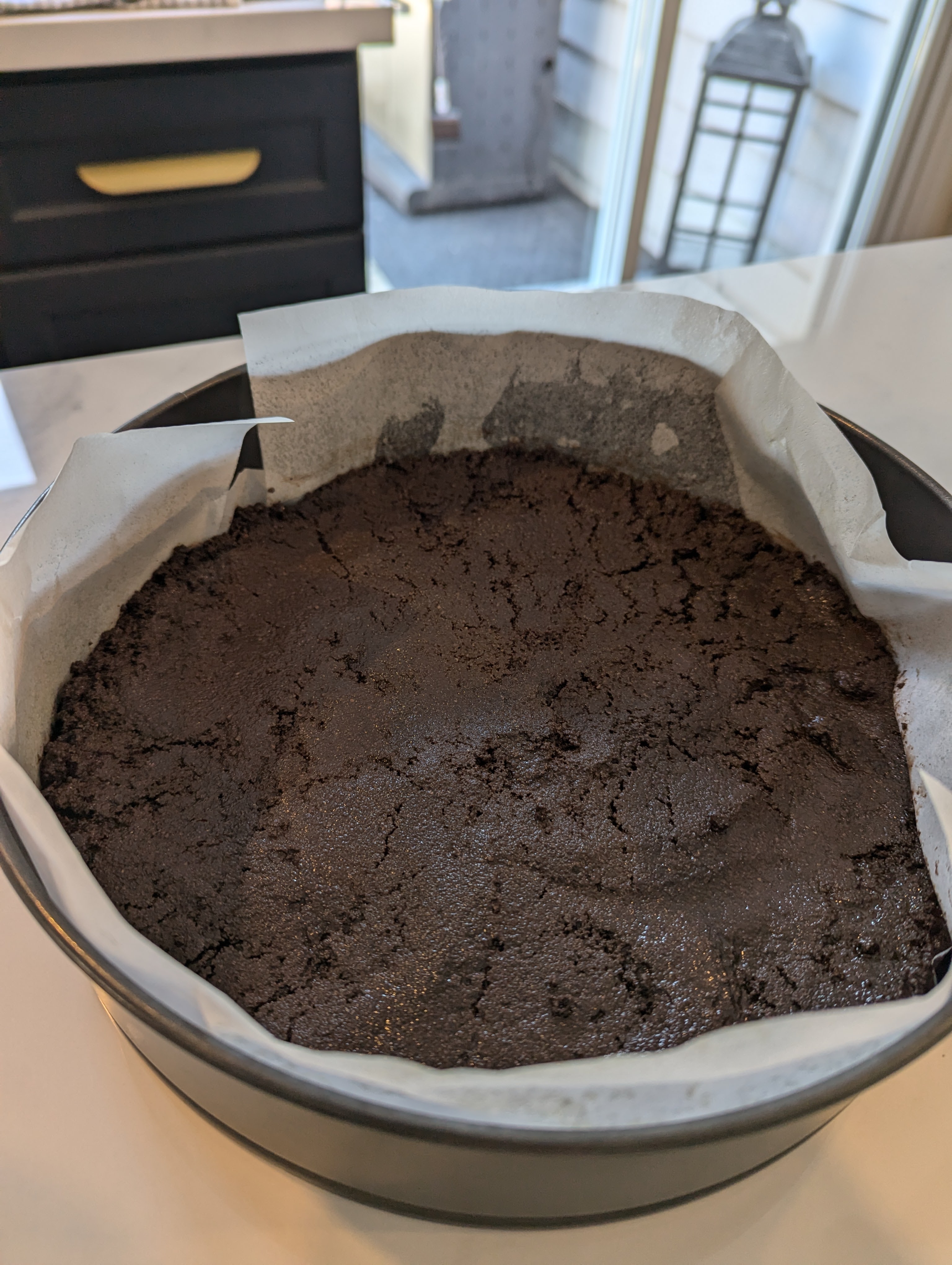 Grease a 9-inch springform pan with baking spray and line with parchment circle. Grease parchment. In a food processor, combine wafer cookies and melted butter. Pulse until cookies are finely ground. Transfer cookie mixture to the prepared pan and press evenly and firmly into the bottom. Freeze the pan for about 30 mins until the crust sets.