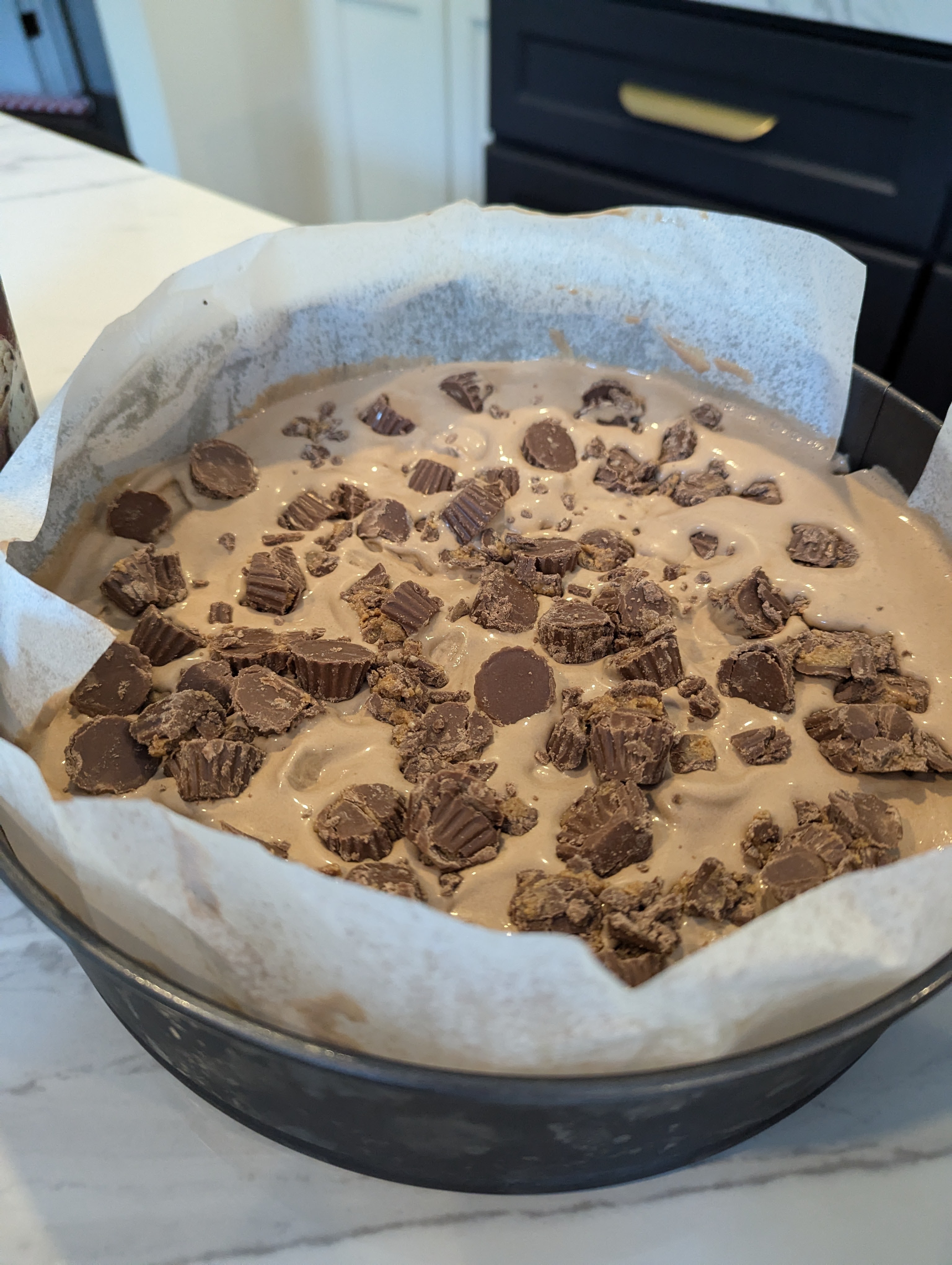 Before serving, run a hot knife along the edges and release from springform pan. Decorate with whipped cream or cool whip. Top with peanut butter cups. Enjoy!