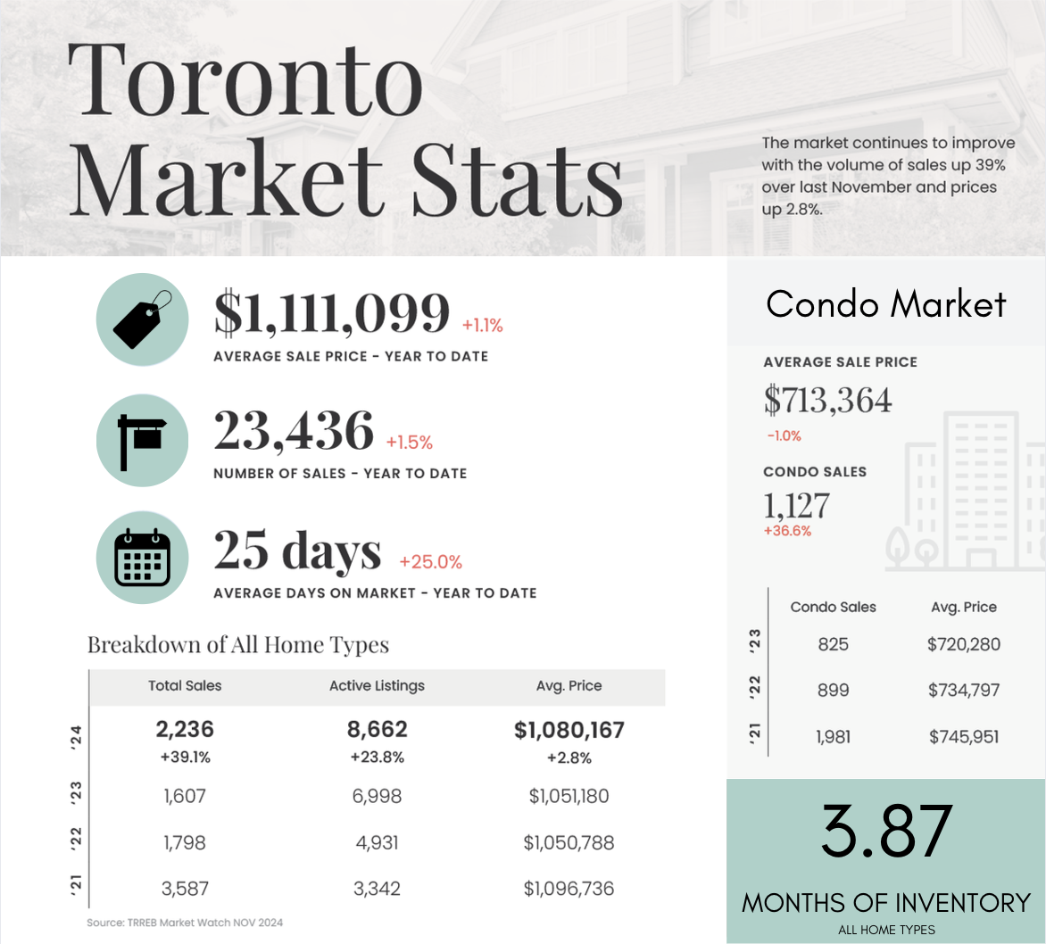 Winter is slowly moving in and I am sure some of us are more excited to see the snow than others. In sharing some warmer news the Greater Toronto Area home sales increased strongly on a year over year basis in November. Many buyers benefitted from more affordable market conditions brought about by lower borrowing costs. The number of new listings were also up compared to November 2023 but by a much lesser annual rate. This is resulting in tighter market conditions and contributing to overall average price growth compared to last year. With the momentum we are experiencing we expect an accelerating market recovery in 2025.